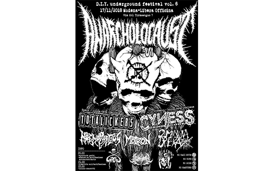 Tornando a noi, ci siamo dimostrati piuttosto aperti. Difatti il report di oggi va a raccontarvi quell’accozzaglia di degrado (quello bello) e musica estrema che è stata la sesta edizione dell’Anarcholocaust.