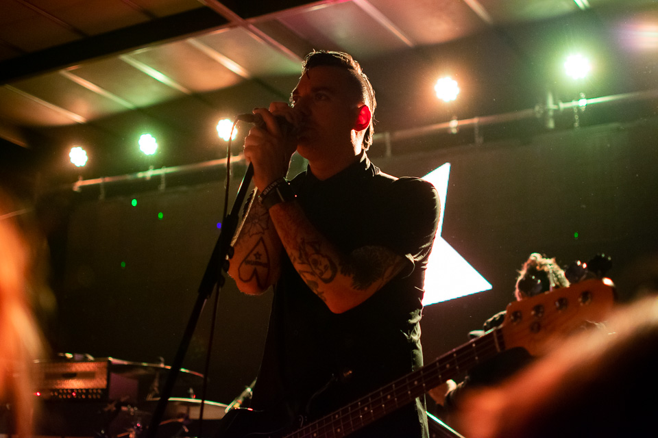 Passano pochi minuti e la sala, colma di gente, viene inondata dalle note di “Blitzkreig Bop” dei Ramones. Non nego che per un paio di secondi mi sono immaginata di essere al concerto dei Green Day. E invece ecco che la cresta di Justin Sane fa capolino dal tendone e finalmente gli Anti-Flag salgono sul palco. Le urla riempiono la sala e la band inizia con “Die for your government”, inutile dire la bolgia che si è creata. Sono a metà canzone e un sacco di gente sta già facendo stage diving, che bellezza. Dalle facce dei ragazzi della band credo che non si aspettassero una risposta così potente dal pubblico. Per fortuna il pit è vivo più che mai, pronto a cantare ogni singola canzone fino a perdere la voce. Si prosegue veloce con “Broken Bones”, “Racists” e “Cities burn”. Piccola pausa per riprendere fiato e si riparte a cannone con “Fuck police brutality” con Chris che salta come un folle, non c’è verso di far calmare un po’ l’aria sotto il palco. Avanziamo con “1 trillion dollars”, “Power to the peaceful” pugni in aria e continuiamo con “This is the end”. Un break per continuare poi con “American attraction”, “Death of a nation”, “When the walls falls”, “The press corpse”, e “Drink drank punk”. Siamo giunti alla fine. È il momento del cavallo di battaglia “Brandenburg Gate” dove il batterista (questa volta non Pat visto che è a casa con il figlio appena nato e a cui inviamo i migliori auguri!) scende nel pit insieme a Chris. Inizialmente pensavo “Ma come fanno a scendere che è stra pieno” e vedendo tutti i ragazzi salire sul palco mi immaginavo un finale in stile Suicidal Tendencies e invece no, era per fare spazio alle pelli. I kids scendono dal palco per tornare nel pit con Chris e il batterista di nome Eric (credo) e l’empatia che si crea tra la band e il pubblico è qualcosa di fenomenale, come sempre. Per un attimo chiudo gli occhi e mi viene in mente la loro esibizione al Bay Fest quando partirono i fuochi d’artificio nel momento in cui iniziò questa canzone, chi c’era può capire.