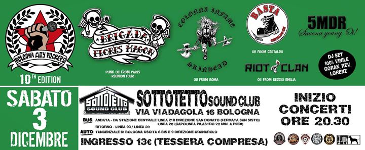 Attendevo da tempo la serata del 3 Dicembre al Sottotetto di Bologna, sia perchè i Colonna Infame non li avevo mai visti, sia perchè le serate di Bologna City Rockers sono sempre piene di bella gente e grande punk oi. E allora via i pensieri e ci si dirige al locale dove il collettivo ci dona questa decima edizione del loro fest.