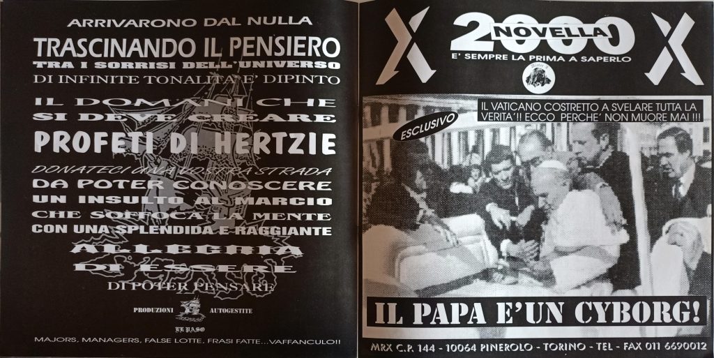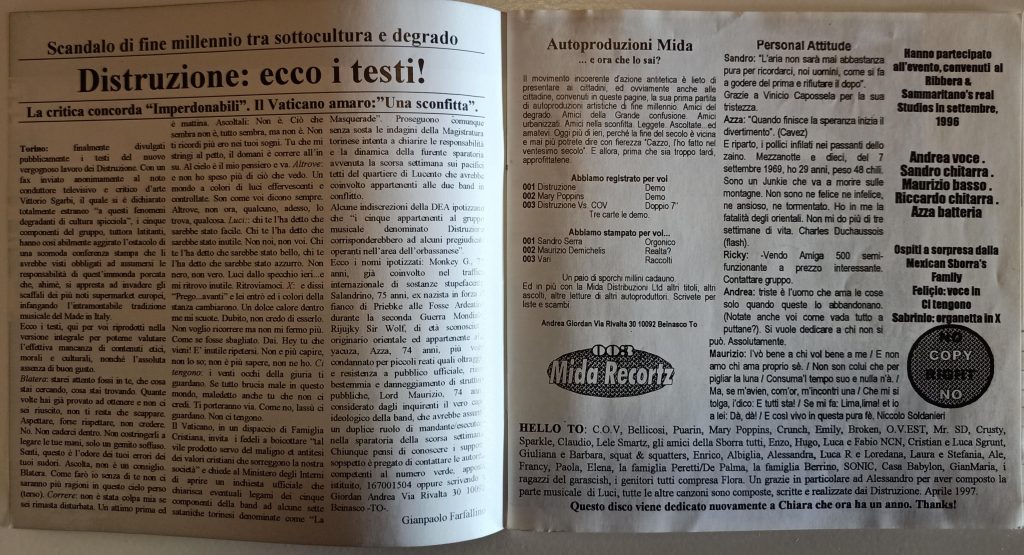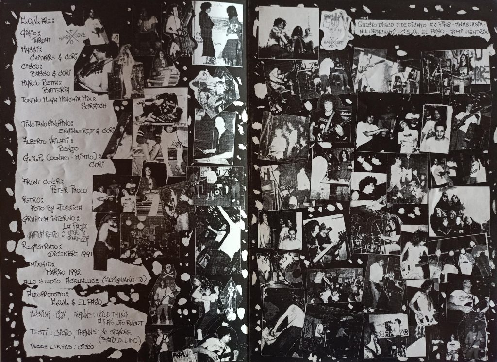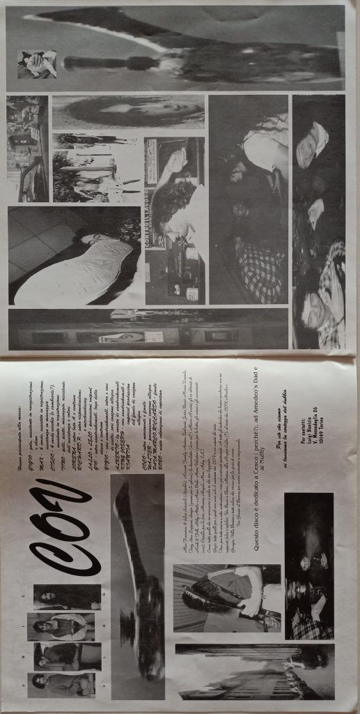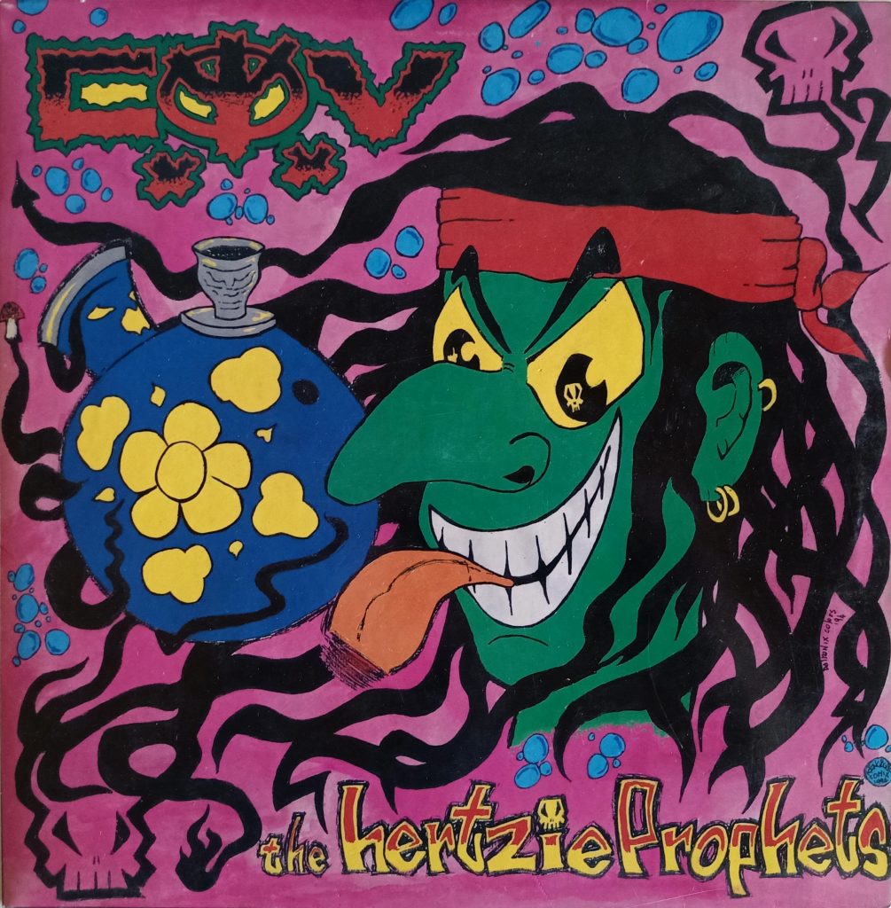 1994. Appena due anni dopo ecco subito il secondo album “The Hertzie Prophets” sempre autoprodotto dal gruppo in combutta con El Paso, in cui i C.O.V. non accennano minimamente a smorzare i toni, come del resto non faranno mai durante la loro esperienza. Anche in questo caso, l’album scorre come un flusso di coscienza giornaliero, altalenante tra l’assurdo e l’introspettivo. Qui si è, non ci si atteggia. Aritmie continue tra l’hardcore in salsa torinese – “Traccia”, “Rincorrendo” – e degli svarioni dub strumentali come “Roipnol2 e “Bhang” disorientano e allo stesso tempo fanno acclimatare nel disco, mentre “Sandrinkemall” e “Izolraitforiu” sono divertimento senza filtro. La strada intrapresa col primo album è tutt’altro che finita insomma, birre fredde e cartine ne abbiamo ancora parecchie, quindi non si molla un cazzo. La miscela di spezie dei C.O.V. ormai è consolidata, un miscuglio personalissimo di punk, hardcore, reggae, allucinazioni, ironia e dialoghi con la propria mente che tutt’oggi risulta inimitabile. Il loro autodefinito “hashish-core” sarà infatti una delle fonti di ispirazioni maggiori per un gruppo che di lì a poco scriverà un altro importante capitolo del punk hardcore – almeno per me – dei ragazzi che si faranno chiamare BelliCosi. Come già sperimentato nel primo album, il disco è corredato di un libretto folto di disegni, testi e inserti assortiti. Le immagini che allego sono tutte scansioni delle copie in mio possesso, perché oltre alla musica trovo che graficamente siano una bomba e che quindi debbano essere diffuse anche a chi non li conosce. Mi auguro sia una cosa gradita.