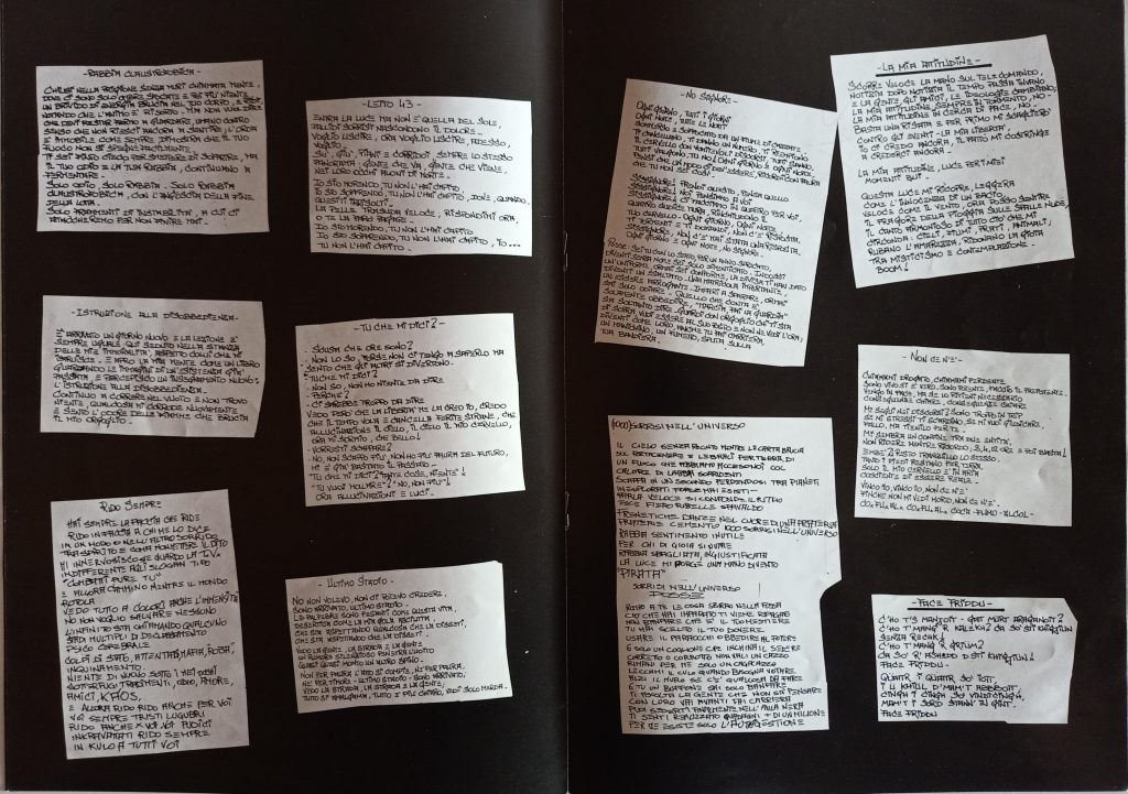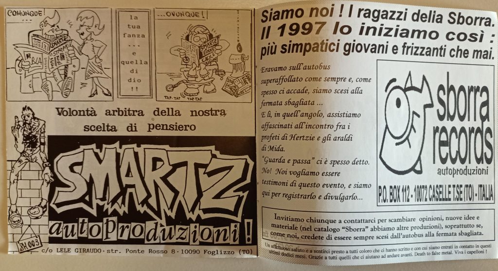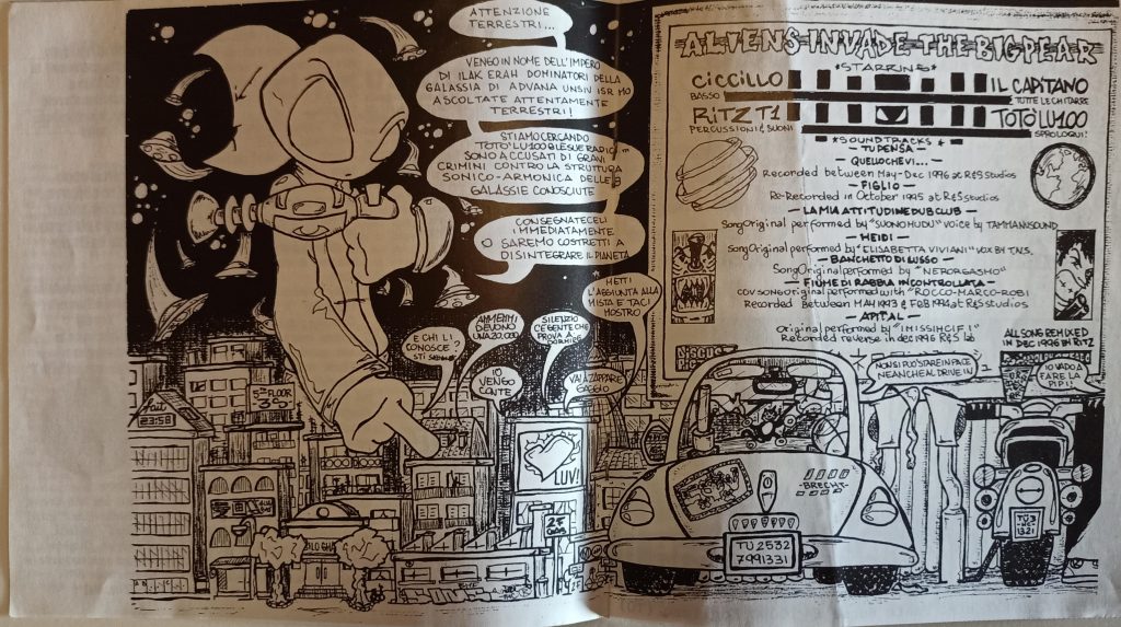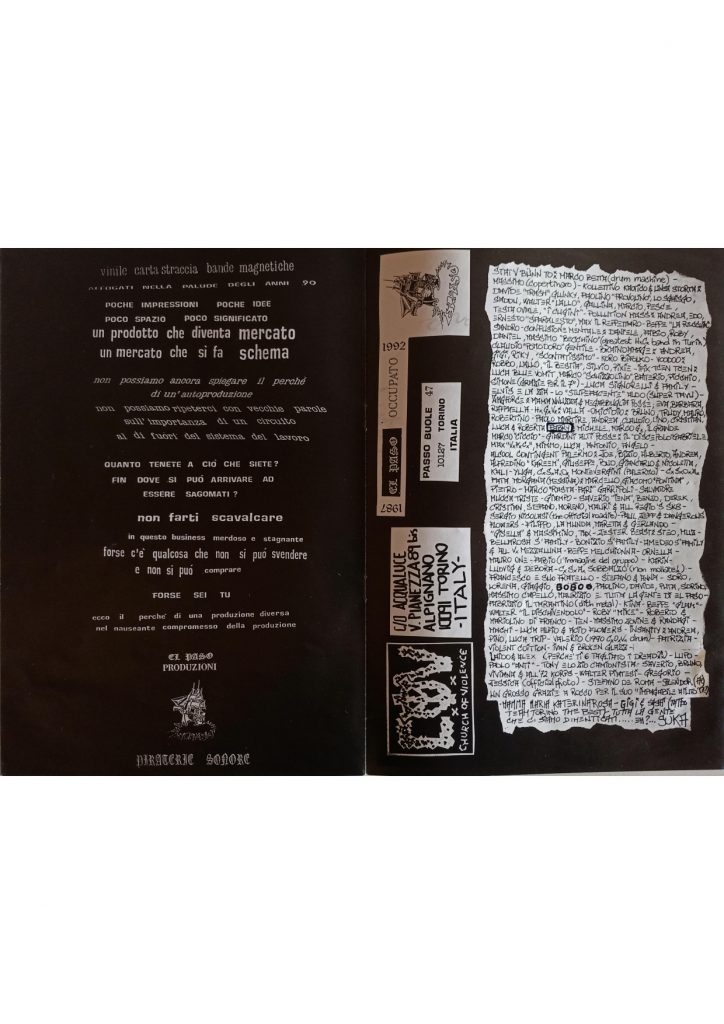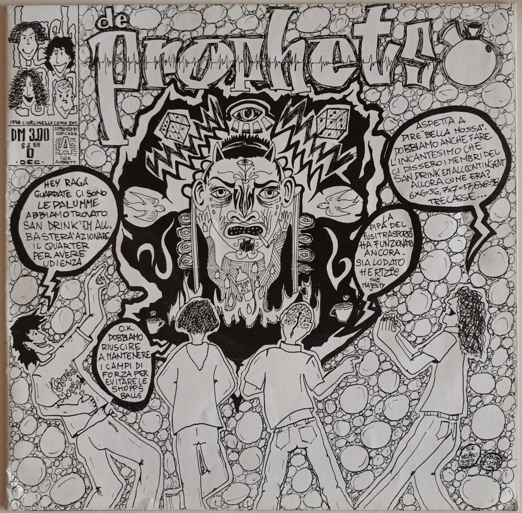 1994. Appena due anni dopo ecco subito il secondo album “The Hertzie Prophets” sempre autoprodotto dal gruppo in combutta con El Paso, in cui i C.O.V. non accennano minimamente a smorzare i toni, come del resto non faranno mai durante la loro esperienza. Anche in questo caso, l’album scorre come un flusso di coscienza giornaliero, altalenante tra l’assurdo e l’introspettivo. Qui si è, non ci si atteggia. Aritmie continue tra l’hardcore in salsa torinese – “Traccia”, “Rincorrendo” – e degli svarioni dub strumentali come “Roipnol2 e “Bhang” disorientano e allo stesso tempo fanno acclimatare nel disco, mentre “Sandrinkemall” e “Izolraitforiu” sono divertimento senza filtro. La strada intrapresa col primo album è tutt’altro che finita insomma, birre fredde e cartine ne abbiamo ancora parecchie, quindi non si molla un cazzo. La miscela di spezie dei C.O.V. ormai è consolidata, un miscuglio personalissimo di punk, hardcore, reggae, allucinazioni, ironia e dialoghi con la propria mente che tutt’oggi risulta inimitabile. Il loro autodefinito “hashish-core” sarà infatti una delle fonti di ispirazioni maggiori per un gruppo che di lì a poco scriverà un altro importante capitolo del punk hardcore – almeno per me – dei ragazzi che si faranno chiamare BelliCosi. Come già sperimentato nel primo album, il disco è corredato di un libretto folto di disegni, testi e inserti assortiti. Le immagini che allego sono tutte scansioni delle copie in mio possesso, perché oltre alla musica trovo che graficamente siano una bomba e che quindi debbano essere diffuse anche a chi non li conosce. Mi auguro sia una cosa gradita.