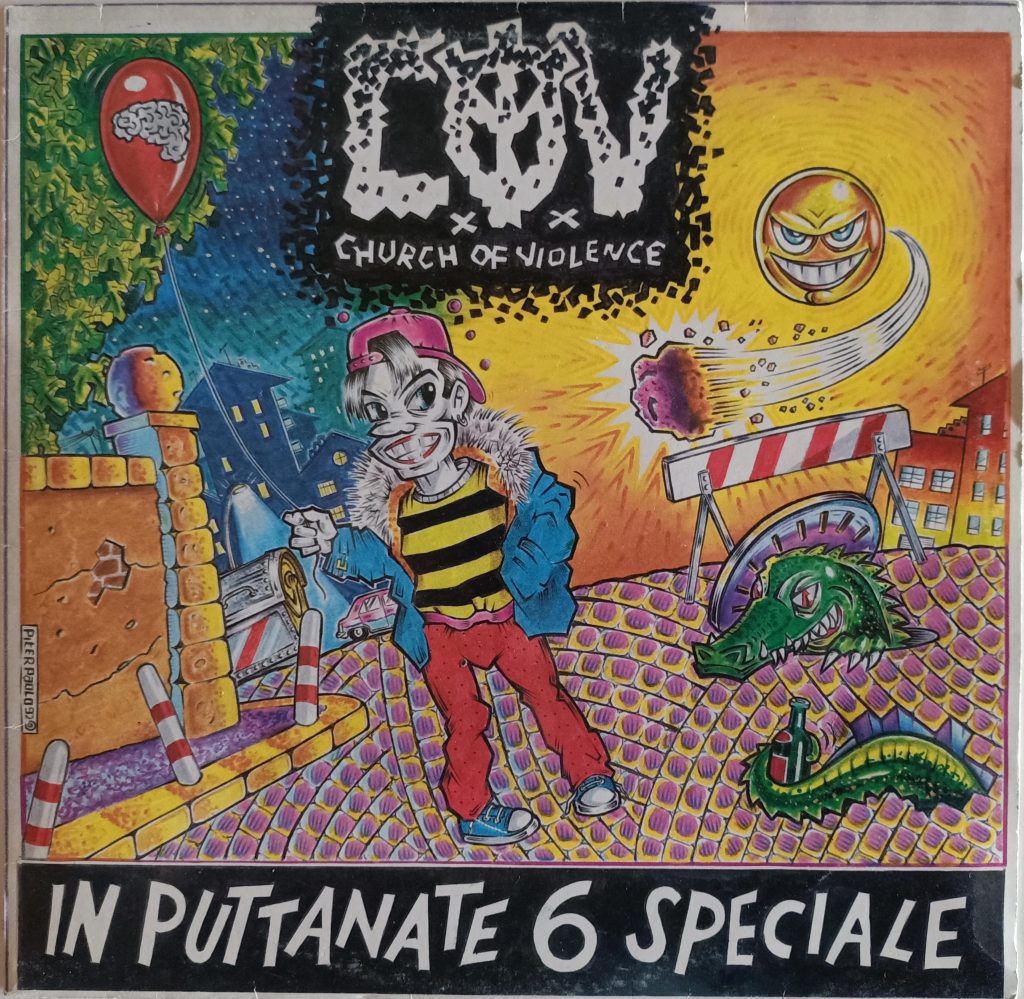 La brace è accesa, adesso si griglia. Poco dopo questa prima uscita e i conseguenti primi concerti, i C.O.V. si assestano anche come formazione, con l’arrivo di Tino Paratore alla batteria, Gigio Bonizio alla voce (che più tardi sarà anche cantante degli Arturo n.d.a.), Max Bellarosa alla chitarra e Cisco Amedeo al basso comporrà la rosa classica del gruppo. Neanche due anni dopo il demo, vede la luce l’album con cui li ho conosciuti e che amo particolarmente. Nel 1992 esce la prima prova dei Church Of Violence sulla lunga distanza: “In Puttanate 6 Speciale”, autoprodotto da El Paso ed orgogliosamente “pirata”, come si legge nel libretto dei testi interno. Un mondo bizzarro, a colori smalto e pastello, disseminato di canne fatte con due cartine corte (cosa che a trenta e passa anni mi sembra ancora funambolica) sudore e croste sulle ginocchia. O almeno questo è quello a cui lo ricollega la mia testolina. Hardcore, punk, filastrocche, incursioni reggae, scratchate e semi improvvisazioni hip-hop, troppe portate tutte insieme per metabolizzarle al primo ascolto. Fu proprio mettendomelo in cuffia in autobus, in aula studio e cazzeggiando che lo imparai letteralmente a memoria nel giro di qualche settimana, sono riuscito a recuperare una copia fisica in LP solo diversi anni dopo, quando ormai avevo quasi esaurito le speranze. “In Puttanate 6 Speciale” ha un equilibrio tutto suo, in bilico tra la lezione dell’hardcore italiano di Negazione e Nerorgasmo – che si fa sentire forte e chiara in “Letto 43” – le saette dei Bad Brains e la sana cazzonaggine. Ascoltandolo si percepisce urgenza, bisogno di tirar fuori, di alzar la voce, sfogarsi e mandare in culo un po’ tutti. Che sia attraverso i testi più personali di “Istruzione alla Disobbedienza” e “Rabbia Claustrofobica” – due dei pezzi già usciti nel primo demo, qui riregistrati – le divagazioni semi-reggae di “Sorrisi nell’Universo”, le filastrocche di “Face Friddu” o la reinterpretazione della celeberrima sigla di Ufo Robot che apre il lato A dell’album, i Church of Violence mi hanno sempre trasmesso una profonda e disinteressata spontaneità. Il loro hardcore è unico, nessuno suona così, li riconosci all’istante. Non mi sorprende affatto l’assuefazione che ho sviluppato nei confronti di questo disco, atipico e assurdo, in altre parole, imperdibile.