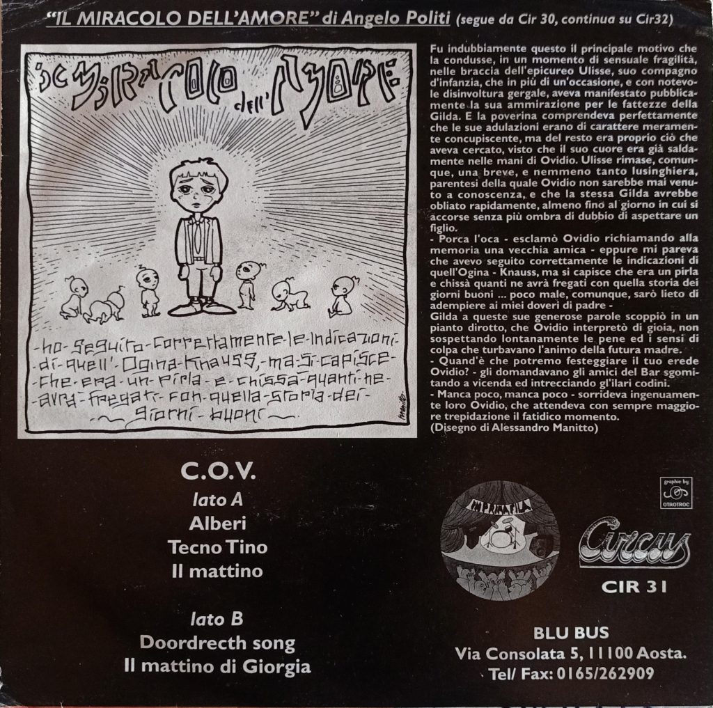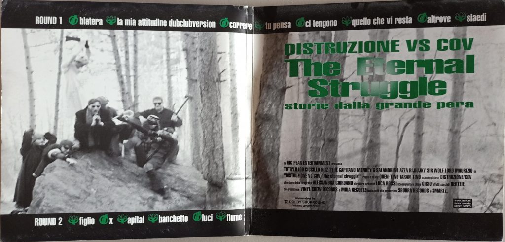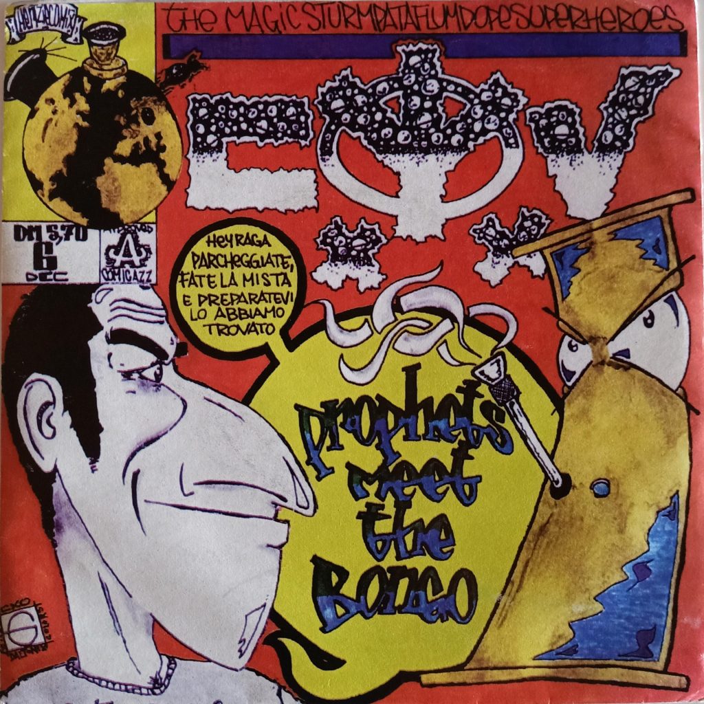La fase finale dell’attività dei C.O.V. si suddivide in due episodi di minore minutaggio rispetto ai due album, ma non per questo di minore incisività. Nel 1996 e nel 1997 escono in rapida successione due EP, il 7” “Prophets Meet the Bongo” e lo split nel singolare formato doppio 7” con i concittadini Distruzione, intitolato “The Eternal Struggle – Storie dalla Grande Pera”, quest’ultimo frutto di una coproduzione kilometro zero tra Smartz Records, Mida Recordtz e Sborra Records – etichetta appunto dei Bellicosi – entrambi accompagnati da un mini fumetto allucinato e delirante ormai marchio di fabbrica delle produzioni dei C.O.V. “Prophets Meet the Bongo” è un personalino perfettamente bilanciato, prodotto dalla Circus Records, una costola della Blu Bus, che mi auguro non abbia bisogno di presentazioni. Una mista di dub/reggae e hardcore all’italiana, dove prevale una maggiore introspezione nei testi, senza tuttavia mai prescindere dal caffè corretto delirio del “Mattino di Giorgia”. In “The Eternal Struggle – Storie dalla Grande Pera” i C.O.V. propongono ben due cover – cosa tutt’altro che insolita, ascoltate i due album e capirete il perché – una versione se possibile ancor più agguerrita dell’originale di “Banchetto di Lusso” dei Nerorgasmo e una tanto geniale quanto delirante variante de “La Tipa della Casa Occupata”. La controparte dello split, ovverosia i Distruzione, è più improntata ad un noise rock/hardcore malinconico e martellante non meno degno di nota, per quanto non siano delle sonorità molto nelle mie corde, per lo meno in questo periodo della mia vita, un domani chissà.