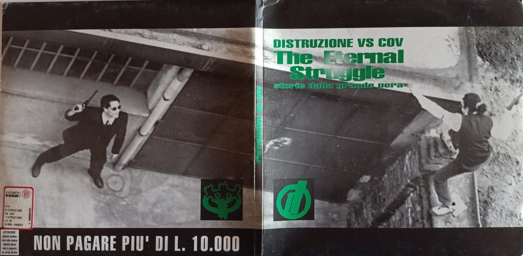 La fase finale dell’attività dei C.O.V. si suddivide in due episodi di minore minutaggio rispetto ai due album, ma non per questo di minore incisività. Nel 1996 e nel 1997 escono in rapida successione due EP, il 7” “Prophets Meet the Bongo” e lo split nel singolare formato doppio 7” con i concittadini Distruzione, intitolato “The Eternal Struggle – Storie dalla Grande Pera”, quest’ultimo frutto di una coproduzione kilometro zero tra Smartz Records, Mida Recordtz e Sborra Records – etichetta appunto dei Bellicosi – entrambi accompagnati da un mini fumetto allucinato e delirante ormai marchio di fabbrica delle produzioni dei C.O.V. “Prophets Meet the Bongo” è un personalino perfettamente bilanciato, prodotto dalla Circus Records, una costola della Blu Bus, che mi auguro non abbia bisogno di presentazioni. Una mista di dub/reggae e hardcore all’italiana, dove prevale una maggiore introspezione nei testi, senza tuttavia mai prescindere dal caffè corretto delirio del “Mattino di Giorgia”. In “The Eternal Struggle – Storie dalla Grande Pera” i C.O.V. propongono ben due cover – cosa tutt’altro che insolita, ascoltate i due album e capirete il perché – una versione se possibile ancor più agguerrita dell’originale di “Banchetto di Lusso” dei Nerorgasmo e una tanto geniale quanto delirante variante de “La Tipa della Casa Occupata”. La controparte dello split, ovverosia i Distruzione, è più improntata ad un noise rock/hardcore malinconico e martellante non meno degno di nota, per quanto non siano delle sonorità molto nelle mie corde, per lo meno in questo periodo della mia vita, un domani chissà.