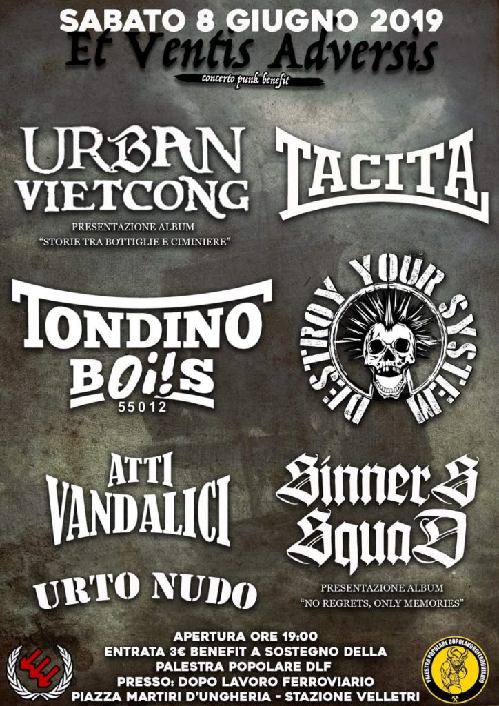 I primi a suonare sono gli Urto nudo, giovani ragazzi che fanno ricordare gli Skruigners. Grandi, bella bombetta. I successivi sul palco sono i Sinners Squad, un gruppo toscano che con il loro street punk lascia la maggior parte della gente a bocca aperta, tanto che in giro si sente la gente dire “Cazzo, sembrano i Social Distortion”. A fine concerto, Fier tira fuori il suo borghetti autoprodotto che si fa apprezzare e fa impazzire molte persone. Subito iniziano a suonare i Destroy Your Sistem, un hardcore punk old school con influenze dai Discharge. Alla fine del live ritorniamo come sempre al bancone a cercare ristoro, viste le temperature elevate della giornata, e scambiamo qualche chiacchiera con i baristi. Usciamo fuori che stavano già suonando gli Atti Vandalici, gruppo Oi! della capitale. Carichissimi, coinvolgono subito il pubblico con i loro pezzoni. Successivamente, inizia a suonare il quinto gruppo: Tondino bOi!s, che fanno notare da subito la loro prestante attitudine alcolica. Suonano uno street punk vero ignorante. Il penultimo gruppo sono i romani Tacita, con uno street rock molto tecnico. Peccato non abbiano suonato molti pezzi del nuovo album, ma è sempre un piacere sentirli. Gli ultimi a suonare sono i livornesi Urban Vietcong, boia de’, con il loro Oi! bello duro. Per l’occasione hanno presentato il loro ultimo album.