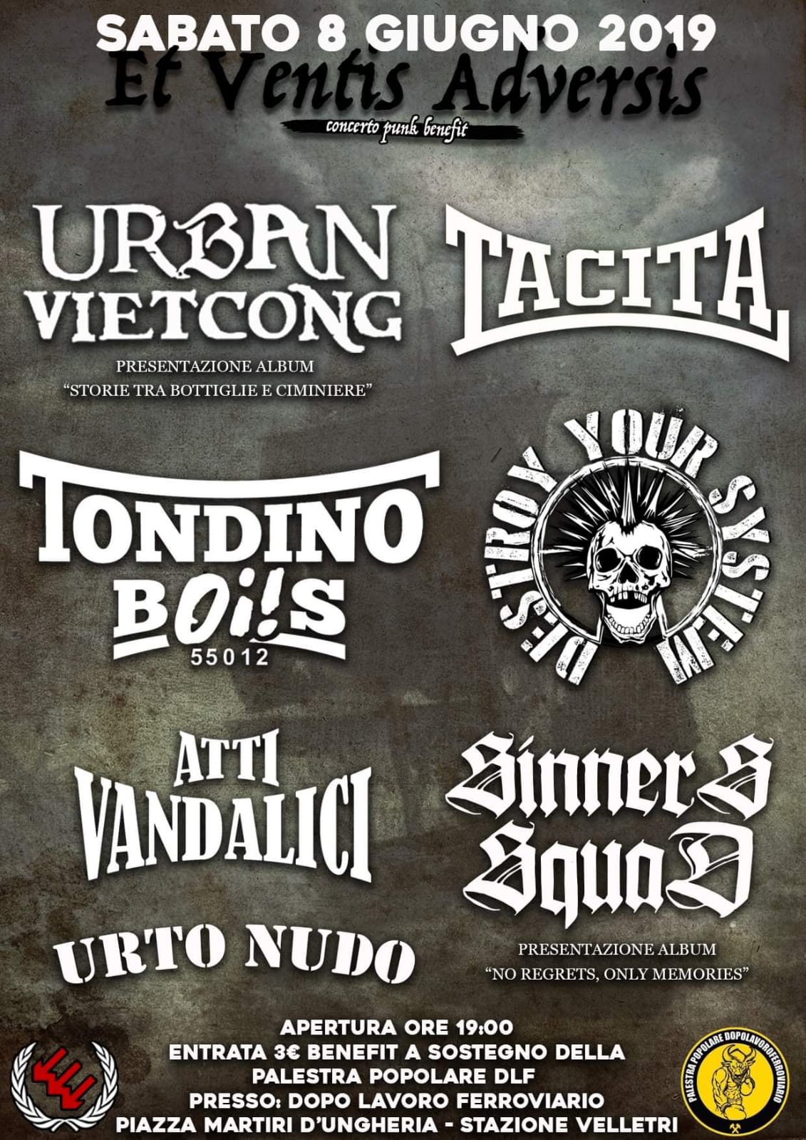 Io e Fier partiamo per Velletri, verso il concerto benefit per la Palestra Popolare Dopolavoroferroviario organizzato dai Torpedos Roma. Appena arrivati facciamo un giro per questo ex Dopolavoro, assegnato ai ragazzi della palestra popolare tramite un bando delle Ferrovie dello Stato in cui davano in gestione i loro spazi dismessi ad associazioni di vario tipo. Il posto è molto accogliente: c’è un bel giardino all’aperto, dove per l’occasione era sistemato anche il palco, un bar e la struttura della palestra, divisa fra sala biliardo e la vera e propria sala degli allenamenti, dove praticano pugilato, pesistica e martelli. Una palestra veramente ben equipaggiata, tenuta con cura. Ovviamente tutto questo dopo esserci rinfrescati la gola al bar dopo un lungo viaggio.