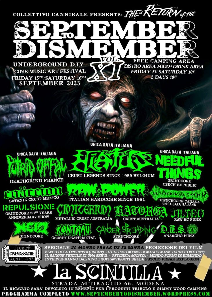 Collettivo Cannibale: Although some of us had already taken part in the organization of other DIY festivals (without sponsors, without institutional recognition, without beggin’ for permission…), as a collective the last edition of September to Dismember was our first ‘big’ experience in that sense, with all that this implies in order to be called a festival and not just a ‘long concert’. It is no secret that from the very beginning of our adventure as Collettivo Cannibale there was a great desire to revive a certain type of ‘scene’ that, two years ago, in our area seemed to be gradually dying out. Thanks to the drive of young comrades and the participation of friends who were already navigating the underground circuit of Bologna, the creation of September to Dismember was at the same time a challenge, a tribute and, above all, a satisfaction. It could be said that it was like calling for a continuity with a past that is dear to us, which should be continued, but not necessarily idealized and retraced.