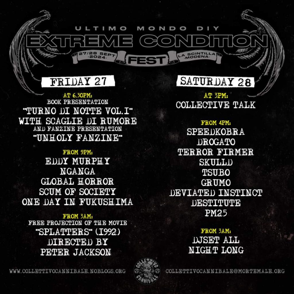 Collettivo Cannibale has been active in the crust, grindcore, sludge and generally into the extreme music scene for some time now, they also organize many movie showing and solidarity and mutual aid’s initiatives. Well-established in Bologna – in Bolognina’s area, to be precise – They have promoted countless events in different places, often touching other cities such as Imola and Modena. In the latter, the first Extreme Condition Festival will take place on 27 and 28 September 2024, in the historic occupied social center La Scintilla. In the following interview we’ll discover more about the collective and this new festival!