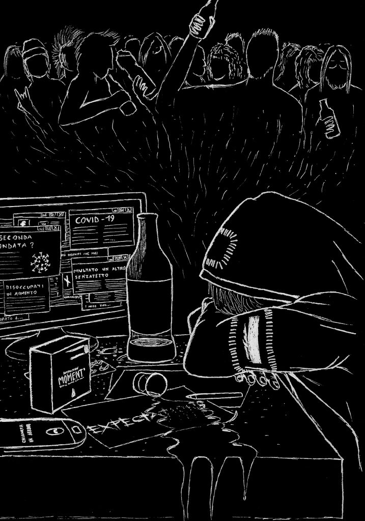 Distanze, nostalgia, incertezze, rabbia, sconforto, un insieme di emozioni che toglie il sonno. Quindi la notte la passavo con lo schermo acceso da un lato, tra notizie e aggiornamenti che non davano molte speranze, e musica che andava di continuo. Dall’altro lato fogli, matite e penne da disegno, a produrre bozze e lavori più impegnati, mettendo su carta qualsiasi cosa mi passasse per la testa. Spesso tutto questo non era sufficiente a frenare gli stati d’animo e la negatività che giorno dopo giorno aumentava sempre più, non sono state rare le volte in cui a tenermi compagnia c’era la bottiglia di qualcosa, altra protagonista del disegno, insieme a continue emicranie che riuscivo a tenere a bada solo prendendo continuamente ibuprofene. Diciamo che il mio fegato ha fatto gli straordinari.