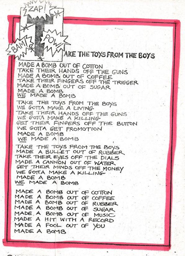 Vi, Lance and the Poison Girls’ weren’t just sad, problematic, and devastating songs. Every now and then a corrosive chart-topping piece would come out of their hands and heads – indie, mind you. I used to put this one on the radio a lot, because it’s an all too clever lyric, tacked on top of a simple rock’n’roll that immediately catches on and over which, as an alternative to pogoing, you can even dance the twist. It’s called ‘State control‘: