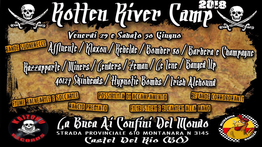 Chi ci segue con costanza ha sicuramente sentito parlare del Rotten River Camp, festone punk/oi/hc tirato su alla vecchia maniera da Kaizoku Records e Rumagna Sgroza. L’evento più piratesco dell’anno si svolgerà il 29 e 30 giugno a Castel Del Rio, quindi tra meno di una settimana! Le band sono numerosissime e spaccano sia per attitudine che per la loro musica, poi c’è il fiume dove immergersi, c’è l’internazionale trash ribelle e il livello di pattume sarà sicuramente degno dell’accozzaglia di punk e skin presenti! Insomma un weekend da fegati agonisti…